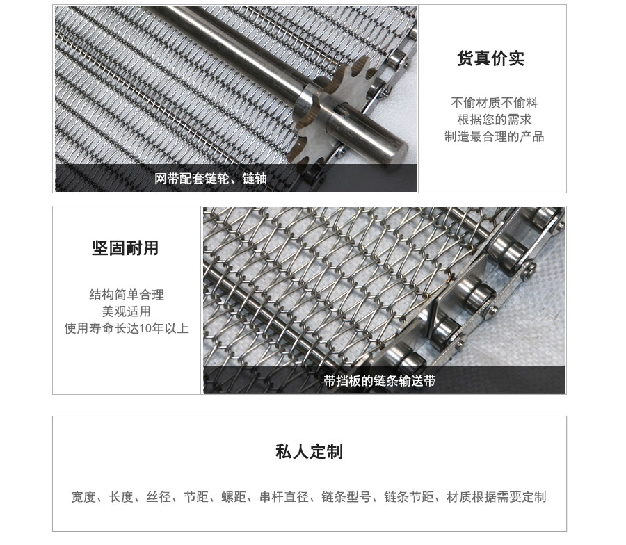 不銹鋼網帶屬于非標準件,我們將根據你提供的規格長寬,材質,絲徑,編制結構尺寸,支軸直徑,支軸間距,鏈條型號等數據核算成本和制作.
