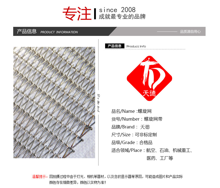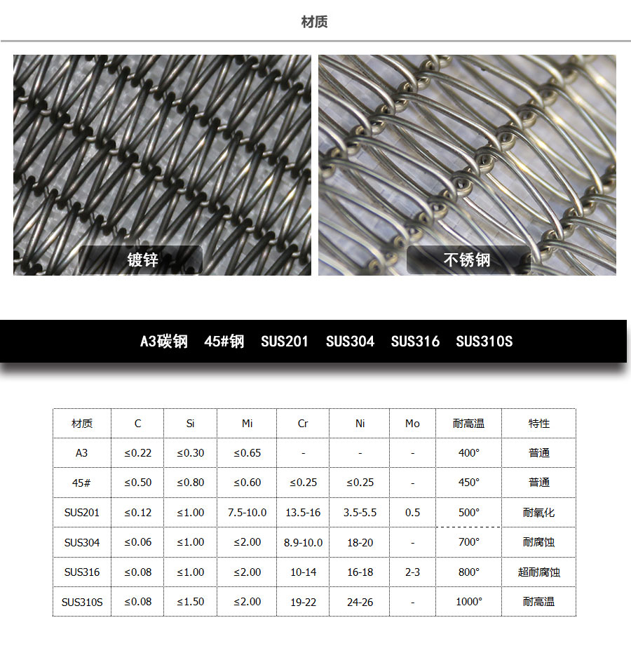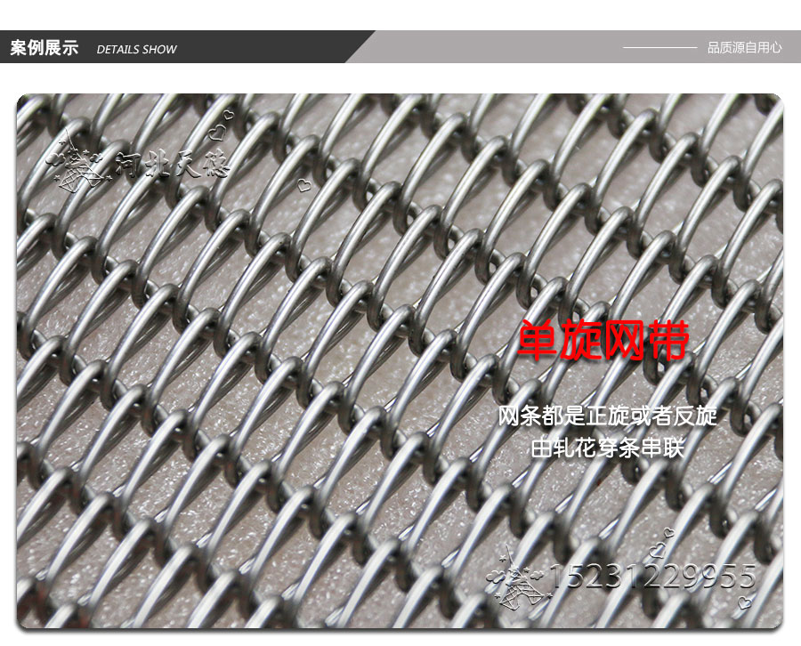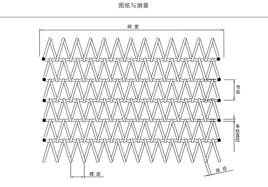 曲軸型:集中了金屬絲編織網帶的各種優點,由于具有彎曲較深的串條,使各個螺旋盤條的位置正確的定位,因此減少網帶的變型和延伸。
