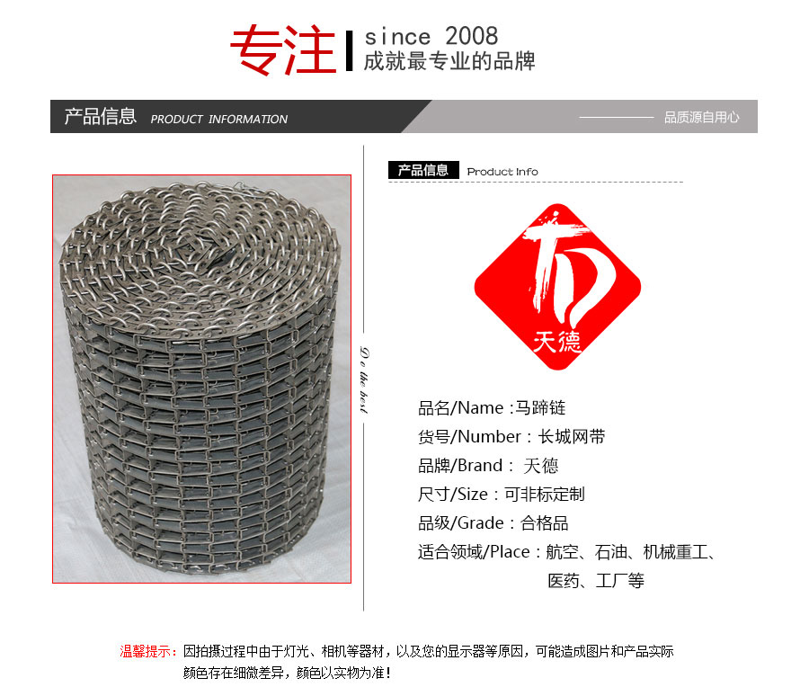 長城網帶材質:有A3低碳鋼、45#鋼、1Cr13耐熱鋼、 不銹鋼、304不銹鋼、1Cr18Ni9Ti不銹鋼、0Cr18Ni14NO2CU2耐熱耐酸鋼等