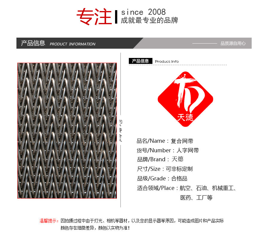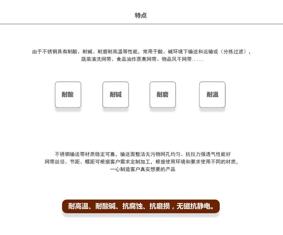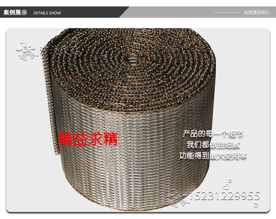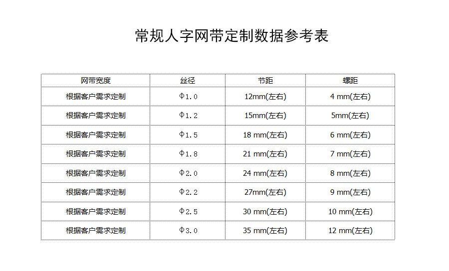 人字形網(wǎng)帶應(yīng)用:主要應(yīng)用于食品烘干機(jī)、蔬菜、海產(chǎn)品清洗機(jī),巴氏機(jī),方便面米粉蒸煮、熱收縮膜包裝機(jī)。玻璃瓶罐、食品、燈炮、金屬、器皿、化纖、印染、醫(yī)藥、電子、粉末冶金、熱處理、木材、物流輸送等各行業(yè)自動(dòng)裝置和自動(dòng)流水線的使用;焦?fàn)t煤氣及電子紅外線等各種窯爐系統(tǒng)的傳動(dòng)使用等食品機(jī)械,玻璃機(jī)械,輸送機(jī)械。