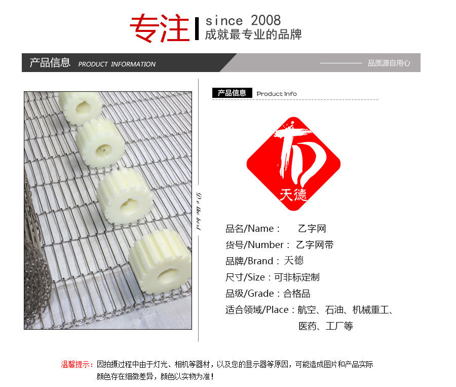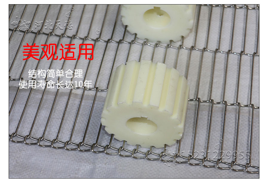 乙字網(wǎng)帶:又稱梯形網(wǎng)帶或一字網(wǎng),此網(wǎng)帶通常系齒輪傳遞網(wǎng)帶,具有透氣性好的優(yōu)點(diǎn),拉力均勻,做工精細(xì),此網(wǎng)帶具有轉(zhuǎn)動(dòng)靈活、平穩(wěn)性好、耐高溫、耐壓力、耐腐蝕、壽命 長等特點(diǎn)。主要用于餅干機(jī)圖層,輕物品輸送及電子回流焊等