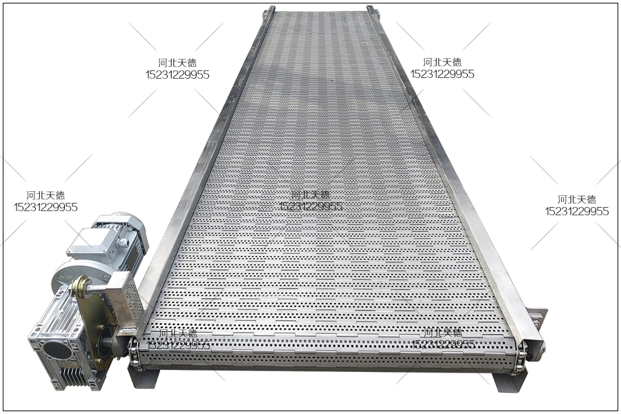 這臺鏈板不銹鋼輸送機的總長度為5米,輸送機總寬度為0.8米,沒有腿,客戶自己根據需要在焊 接機腿。采用3.0毫米厚度的鋼板折彎加工成的機身,不銹鋼鏈板輸送帶的板厚為2.0毫米,輸送鏈條節距為38.1毫米,桿直徑為8毫米,鏈板輸送帶表面打孔的直徑為3.0毫米。配套使用的鏈輪為直徑120毫米左右的。電機采用0.75千瓦電機,配套使用的減速機、變頻器都會安裝好。