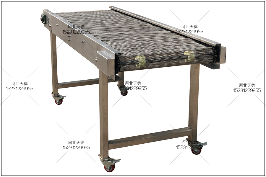 該不銹鋼輸送機(jī)總長為1.5米,總寬度為500毫米,高度為60公分,采用鏈條式不銹鋼輸送帶來傳送物品,采用1.2鋼絲編織的10*20的孔,鏈條節(jié)距采用31.75毫米,使用直徑6毫米的串桿來支撐物料的輸送。大概120毫米左右一個(gè)串桿。
